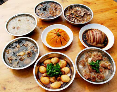 如果說(shuō)靖港的吃名聞遐邇,有口皆碑,那么,八大碗則是靖港吃之翹楚,也是古鎮(zhèn)人引以為榮的傳統(tǒng)名牌。從前靖港街上數(shù)十家有名餐館,都把八大碗當(dāng)作各自的招牌菜,各餐館的廚師也都是潛心研習(xí),精益求精,把烹制出高水平的八大碗當(dāng)作看家本領(lǐng)。曾經(jīng)繁榮昌盛的“小漢口”靖港,那些停船上岸的船夫,載貨而來(lái)的生意人以及慕名而來(lái)的浪人,首先就得進(jìn)餐館吃八大碗,飽其饞吻,享其口福,乃至為了貪吃八大碗而“船到靖港口,順風(fēng)也不走。”而靖港街上的紅白喜事,也是非八大碗不成宴席。