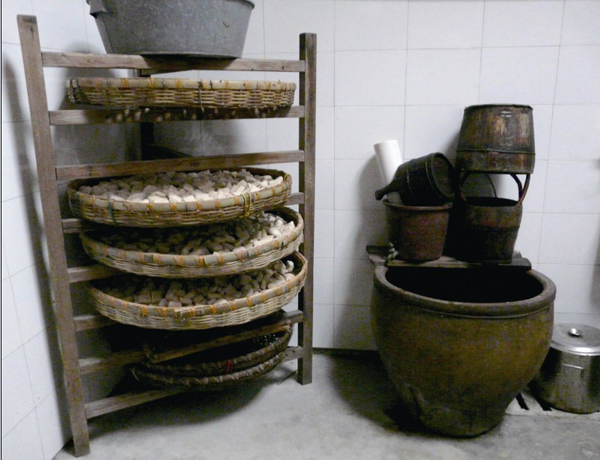 二、發(fā)酵,粉團(tuán)中合進(jìn)“老粉”,以釀帶釀。天熱時(shí),置于案板上,蓋薄布片,使其自動(dòng)發(fā)酵;天泠時(shí),用熱水或火烤,促其發(fā)酵。待粉團(tuán)溢出一股芬香,方為發(fā)酵成功。