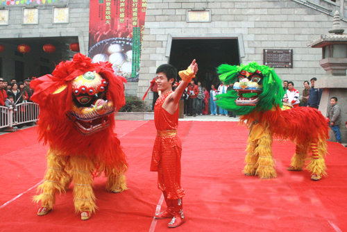 有布獅和毛獅兩種,舞時(shí)又分文獅和武獅。文獅刻畫(huà)獅子溫馴神態(tài),動(dòng)作詼諧細(xì)膩;武獅顯獅子勇猛,動(dòng)作幅度強(qiáng)。舞獅的套子有“藤纏樹(shù)”、“烏云蓋雪”、“牛戀凼”、“泥鰍彈鍋”、“麒麟送子”等。用打擊樂(lè)和吹奏樂(lè)伴奏、氣氛熱烈莊重。舞獅時(shí)還有贊獅者伴唱,唱詞內(nèi)容有反映勞動(dòng)生活、祝賀吉祥、介紹傳說(shuō)故事等,舞獅者隨唱詞內(nèi)容和節(jié)奏進(jìn)行表演。
