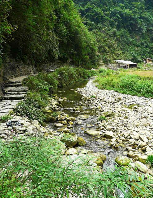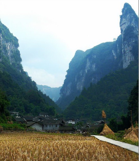 村寨四周山勢(shì)雄奇,絕壁夾天;“夯峽”、“九龍”、“玉泉”三溪在這里相會(huì),如同三根彩帶在這里相交結(jié)。這里是風(fēng)景區(qū)的中心,一萬(wàn)五千多米長(zhǎng)的青石板路從這里一直通向各個(gè)景點(diǎn)這里還是一個(gè)角度十分好的觀景臺(tái),人立于此,只要原地轉(zhuǎn)動(dòng)身子,就可觀賞到東西南北全方位的各個(gè)景點(diǎn),那含情脈脈的“相依巖”、昂首奮蹄的“駟馬峰”、惟妙惟肖的“孔雀開(kāi)屏”五彩繽紛的“彩云壁”和“畫(huà)屏峰”……盡在眼中無(wú)不景象萬(wàn)千,令人目不瑕接。詩(shī)人石元機(jī)贊曰: