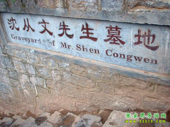 從古城的東門城樓外的虹橋前沿江下行3華里路程,到得聽濤山,從山道向右拾階而上,不遠處便能看見一塊石碑,上寫“沈從文墓地”5個遒勁大字。再不遠處置有一塊豎長的石碑,上面刻有畫家黃永玉為表叔沈從文題寫的碑文:“一個士兵不是戰(zhàn)死沙場,便是回到故鄉(xiāng)。”墓地建在一塊狹長的小草坪上,沒有墳冢,只樹有一塊6噸多重的天然五彩石,成為沈從文墓獨特的標志。石正面鐫刻的是沈從文富有哲學內涵的手跡:“照我思索,能理解我;照我思索,可認識人。”石背面是沈從文的姨妹、美國耶魯大學教授張充和撰書,沈從文侄女婿、中央美術學院著名雕塑家劉煥素教授鐫刻的挽聯(lián):“不折不從,星斗其文;亦慈亦讓,赤子其人。”其聯(lián)句尾四字:“從文讓人”透射出先生一生的高風亮德。沈從文墓地清幽靜謐,四周綠樹環(huán)抱,墓地上和四周的草坪上擺放著無數的野花和竹編的一些蝴蝶,這些都是前來膜拜的旅人們留下的。