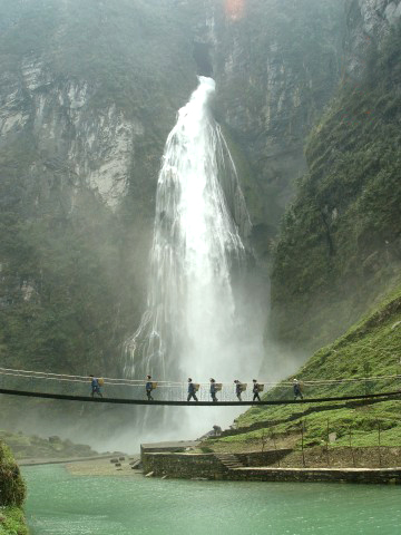 瀑水從斧削狀絕壁上的溶洞奪口噴出,飛流直下,聲如霹靂,數(shù)里可聞,整個(gè)山谷煙云彌漫,霧氣蒙蒙,遠(yuǎn)看瀑布如白練懸空,近看似銀河瀉天際。每當(dāng)陽(yáng)光照耀時(shí),五光十色的浪花似彩虹凌空飛舞,艷麗奪目,蔚為壯觀。瀑高214m,建有一電站。