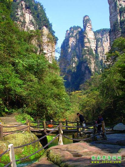 金鞭溪因流經(jīng)金鞭巖而得名,全長5700米,穿行於絕壁奇峰之間,溪谷有繁茂的植被,溪水四季清澈,被稱為“山水畫廊”、“人間仙境”。有詩贊曰:“清清流水青青山,山如畫屏人如仙,仙人若在畫中走,一步一望一重天”。途中你會看到點歌臺,那里有土家姑娘時刻準備為游人唱民族歌曲,只要付十元錢她們就會為你引吭高歌,當(dāng)然,如果你不想花這個錢,也可以在一邊聽聽別人點的歌,聽完后走人。