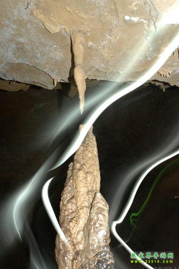 在這兒向您介紹一點溶洞學的知識。在溶洞中,自洞頂往下生長的叫石鐘乳,自洞底往上生長的叫石筍,兩者相向生長連在一起就叫石柱,三者統(tǒng)稱為鐘乳石。這兒有一根石鐘乳與一根石筍是相對生長的,差一點點就要連起來了,但他們卻永遠不能合在一起,因為上面的石鐘乳已經(jīng)沒有滴水,已經(jīng)失去了生命力。這好像一對苦苦守望的情人,近在咫尺,卻永遠不能相逢。于是人們便給他們?nèi)×艘粋€非常動人的名字——恨難逢。“盈盈一水間,脈脈不得語。”“天涯海角有窮時,只有相思無盡處。”在無數(shù)個春去秋來的日子里,他們該有多少離愁別緒??!——真不知道是石頭多情,還是人多情?——而有的人說得很樂觀,“兩情若是長久時,又豈在朝朝暮暮”,所謂“距離產(chǎn)生美”嘛。