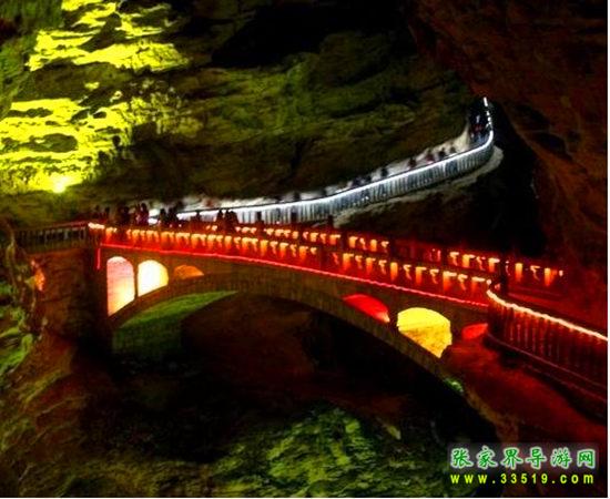 橋長22米,橋面寬3米,距水面17米,這是我國游覽洞穴中最大的石拱橋,是為迎接1995年國際溶洞會議在黃龍洞召開而修建的。橋的欄桿全部用當?shù)氐?ldquo;土特產(chǎn)”木紋石建造。