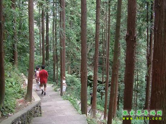 這一大片杉樹林是由張家界國營林場(張家界國家森林公園的前身)工人們種植的。過去“大煉鋼鐵”運動,差點把張家界的山頭全部變成了光頭。后來,一些林場工人抱著“頭發(fā)白在張家界,牙齒掉在張家界,死了埋在張家界”的決心,“獻了青春獻終身,獻了終身獻子孫”,發(fā)誓要植樹造林,綠化張家界。幾十年過去了,許多人綠了青山白了頭,他們的心愿終于變成了眼前的現實。腳下這條彎彎曲曲而又平平整整的游道是20世紀80年代修建的。漫步其上,山風陣陣、鳥雀聲聲、奇花朵朵,群峰在樹林中若隱若現,很有“蟬鳴林逾靜,鳥鳴山更幽”的幽靜與“采菊東籬下,悠然見南山”的悠然。