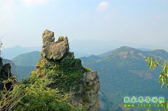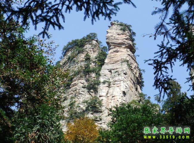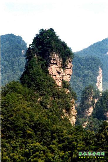 兩支山峰圍成一道天然小石門,大有“一夫當關,萬夫莫開”之勢,人稱南天門,據說過了這道門就是天堂。不過,說來也奇怪,穿過山門之后,山勢為之一變,奇峰怪石,蒼松翠柏,美不勝收,不是天堂,勝似天堂。前面這支位于南天門身邊高200多米的孤立石峰,叫南天一柱。它與一般的山峰不大相同,一般的山峰是下面粗、上面細,而它是上面粗、下面細。山風吹來,這根石柱好像搖搖欲墜,驚心動魄之余,仿佛耳邊還能隱隱約約聽到億萬年前地殼運動時發(fā)出的轟隆隆的巨響——為了“安全”我們還是繼續(xù)往前走吧。