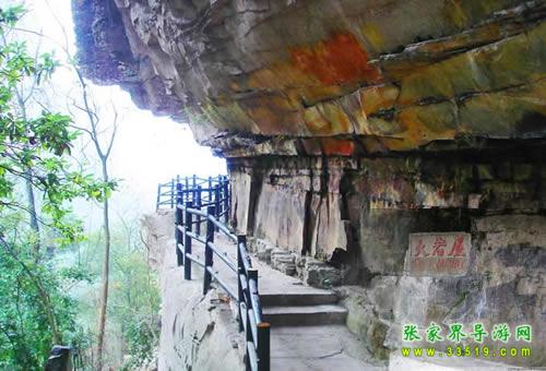 眼前這塊石壁上,中間突出一塊很大的巖罩,形成了一個高3米,進深1—3米,寬20多米的巖屋,人稱大巖屋。這屋以前有窮人住過,當年林場工人也曾在這兒安營扎寨。這兒現在一來可以休息,二來可以觀景。巖屋下20米,有一支山峰很像葫蘆,名叫仙丹葫蘆。有人說那有點像湘泉集團“酒鬼酒”的酒瓶,也有人說有點像王母娘娘的花瓶。自然景觀很多時候往往是這樣,三分相像,七分想象,不說不像,越說越像。