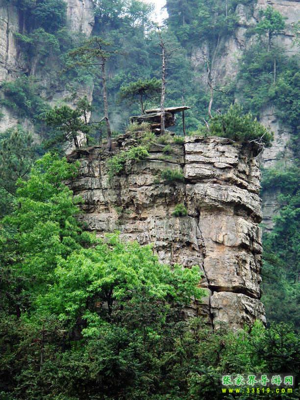 這座拔地而起高300多米的巨大山峰,四面絕壁,頂部面積約4公頃,上面長著黑黝黝一大片原始森林。20世紀70年代,曾有林場工人試圖爬上去考察,但因下雨石滑,無功而返。借助望遠鏡,可以清楚地看到上面生長的武陵松——說起武陵松(又名巖松),可能沒有黃山松那么出名,但其特色卻絲毫不遜于黃山松,堪稱張家界一絕。有人說:“桂林醉人是漓江清,峨眉風流是金頂云,華山險在倚天看,廬山美在泉中聽,不及湘西武陵源,數千奇峰纏綠云,石上長森林。”“石上長森林”說的就是武陵松。她“千年長不大,萬年長不老”,長在絕頂之上或絕壁之中,不論風吹雨打,嚴寒酷署,總是精神煥發(fā),一看見這瘦小而蒼勁的武陵松,就不由讓人頓生對生命的敬意。