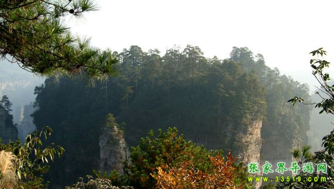 立黃石寨頂東北沿隔澗而望,對面一巖體臺地,高200余米,頂部面積約數(shù)百畝,四圍陡峭如削。其上長滿黑黝黝的樹木,借助望遠鏡,可看清有武陵松等,蒼翠蓊郁,猶如綠色迷宮。