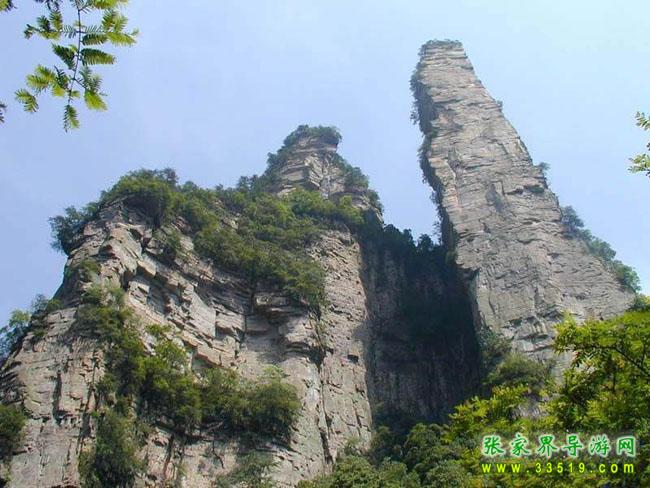 與金鞭巖隔溪對峙,矗立在斜坡上,高200余米。上下粗細一般,峰體渾圓,色赤,呈70度角向金鞭溪傾斜,形似醉酒羅漢,欲倒不倒,似醉非醉,詼諧幽默。清嘉慶學(xué)士彭之臣在峰壁書寫一“忠”字。清道光四年(1824),貢生彭之運作《壁忠記》譯文以彰其勝。風雨蒼桑,“忠”字因山石崩塌遭毀,《記》存于當?shù)刂緯小?/p>