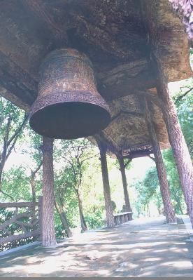 飛來(lái)鐘原為君山崇勝寺的古鐘,南宋淳佑五年(公元 1245 年),荊湖安撫制置使孟珙重修崇勝寺時(shí)復(fù)制一鐘,鐘高一丈多,大數(shù)圍,重4000余斤,上有“淳佑五年造”,鐘身上鑄有“皇帝萬(wàn)歲,國(guó)泰民安,風(fēng)調(diào)雨順,五谷豐登”16 個(gè)大字,四方凸出的部分用青銅澆鑄的四條金龍,栩栩如生,形態(tài)逼真。原鐘在1966 年被砸毀,現(xiàn)在的飛來(lái)鐘是1979 年由市閥門廠復(fù)制而成,高約2 米,直徑1.2 米,重約 2 噸。鐘身上改鑄著鐘相、楊幺起義的戰(zhàn)斗口號(hào)“均貧富,等貴賤”六字,比前者更富有深刻的含義。這口古鐘有段優(yōu)美的傳說(shuō)。相傳南宋初年,洞庭湖畔數(shù)以十萬(wàn)計(jì)的農(nóng)民在楊幺率領(lǐng)下,掀起了轟轟烈烈的農(nóng)民起義。相傳一天夜晚,朝廷派兵前來(lái)偷襲駐扎在君山的楊幺寨,忽然從天上飛來(lái)一口巨鐘,鐘聲陣陣,催醒義軍,奮起抗敵,因此叫飛來(lái)鐘。這是人們深切懷念楊幺起義軍,用各種方式來(lái)表達(dá)贊美之情。古鐘的傳說(shuō)便寄托了人們的這種心情。有人據(jù)此認(rèn)為,原來(lái)的飛來(lái)鐘系楊幺起義軍所鑄的報(bào)警器。