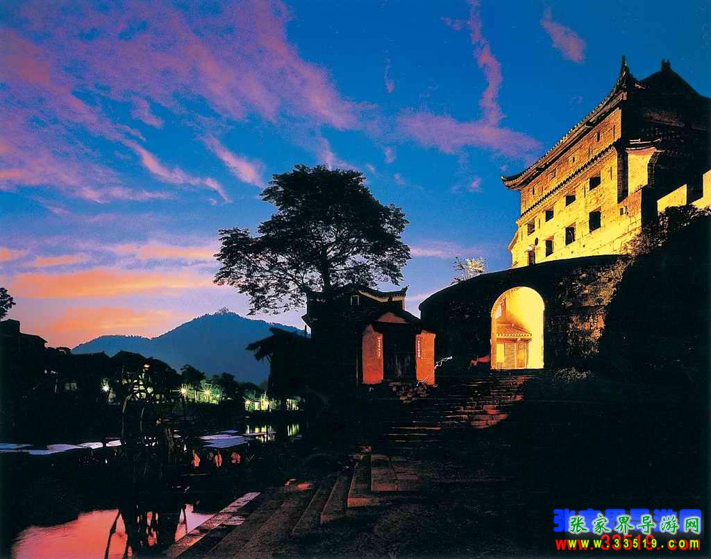 凰山城依偎著沱江,群山環(huán)抱,關(guān)隘雄奇。這里的山不高而秀麗,水不深而澄清,峰嶺相摩、河溪縈回,碧綠的江水從古老的城墻下蜿蜒而過,翠綠的南華山麓倒映江心。江中漁舟游船數(shù)點,山間暮鼓晨鐘兼鳴,河畔上的吊腳樓輕煙裊裊,可謂天人合一。