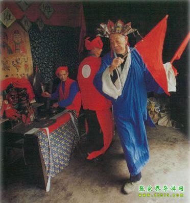 儺戲在湘西土家族地區(qū)也稱儺堂戲、儺神戲,它與土家族原始巫教、巫術(shù)的關系極為密切。土家族先民信奉的神有儺神、八部大神、土地神等,作為一種宗教活動,這種原始信仰與社會生產(chǎn)活動、文娛活動及民族習俗是融為一體的,因此儺戲最先的“沖儺還原”帶有明顯迷信色彩,土家族群眾中有“一儺沖百鬼,一愿了千神”的說法,湘西土家族人干脆叫它為“神戲”。湘西土家族儺戲的發(fā)展過程大體是儺、儺舞、儺儀然后才產(chǎn)生儺戲。儺舞源于久遠的蒙昧時期,土家先民們在同大自然作斗爭、同毒蟲猛獸作斗爭,便產(chǎn)生了化裝護面、在鼓樂聲中奔騰呼號、沖殺跳躍的原始儺舞,其所模擬的鳥雀舞、猿猴舞、熊舞等頗為壯觀。儺舞與儺這種驅(qū)鬼消災的祭祀儀式結(jié)合后,增加了祈求人獸平安、五谷豐登、緬懷祖先、勸人去惡從善、以及傳播生產(chǎn)知識等內(nèi)容,這就逐漸形成了兼?zhèn)潢U弘教義及娛樂性質(zhì)的祭祀風俗歌舞。[2]土家族儺戲就是在此基礎上發(fā)展起來的。部分土家族學者認為土家族儺戲的遠源可以追溯到戰(zhàn)國時代的《九歌》,《九歌》是土家族儺戲的雛形,他們的依據(jù)是當時楚國的沅湘流域,人們“信巫鬼、重淫祀”(《漢書·地理志》),從而使得“陰陽人鬼之間,又或不能無褻慢淫荒之雜”(宋代朱熹《楚辭集注》)。屈原正是加工整理了這一類“鄙陋”之詞,才創(chuàng)作出《九歌》、《天問》等名篇。也有部分學者不贊同這種論點,他們認為土家族儺在宋代還停留在儺祭和儺舞階段,最遲到明代,土家族儺才發(fā)展成為儺戲[3]。嘉靖《常德府志》記載:“歲除,歲將盡數(shù)日,鄉(xiāng)村多用巫師,朱裳鬼面,鑼鼓喧舞竟夜,名曰還儺。”文中未點明“儺戲”二字,但卻使用了“還儺”一詞,這與今天民間對儺戲的稱呼相似。又據(jù)清乾隆《永順縣志》載:“永俗酬神,必延辰郡巫師唱演儺戲,……至晚,演儺戲。敲鑼擊鼓,人各紙面一,有女裝者,曰孟姜女;男扮者,曰范七郎。”在土家族儺戲中,孟姜女傳說故事占著非常重要的地位。在湘西土家族地區(qū),儺戲一般有二十四正戲,即二十四戲神。每次儺儀結(jié)束時,巫師要用香火在黃裱紙上燒二十四個洞,以表示奠祭二十四戲神。民間有諺語:“儺神菩薩不識字,只要二十四個圈圈滿。”在二十四儺神中,被稱為勾愿神的姜女、范郎是還儺愿時非常重要的兩位神靈。在儺戲中,《孟姜女》是整場的高潮,平時,儺戲唱完后,由沒下裝的孟姜女、范郎去向主人家及觀眾“拜臺”,以示“了愿”。清代中期以后,儺戲吸取了花燈、陽戲、高腔等其他地方戲劇劇種的唱腔和劇目,逐漸變得日益成熟。我們仔細查看了全國371個劇種,發(fā)現(xiàn)儺戲、花燈戲有著相同的班社,也就是說一個演出班社可以演出儺戲、花燈戲兩個劇種。這段時期,儺戲已作為獨立戲劇劇種參加演出。由于儺戲是由巫儺法事演變而成的戲劇形式,經(jīng)歷著巫儺法事(驅(qū)鬼祭祀)、儺壇上戲和儺堂正戲的發(fā)展過程。