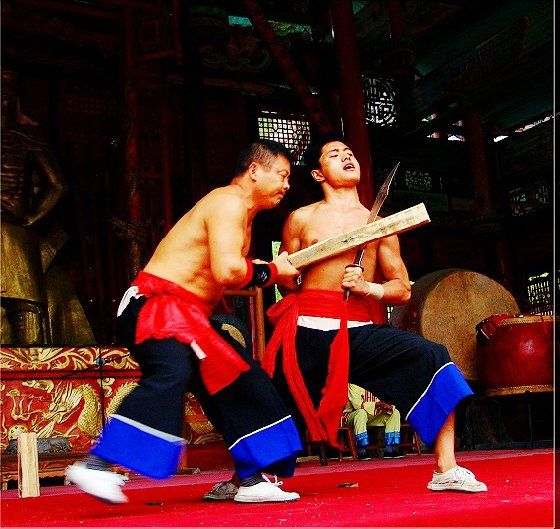 大庸氣,堪稱武林奇葩,曾為祖國贏得聲譽,海內外享有極主名望。 大庸氣功是大庸各民族特別是土家族傳統(tǒng)體育項 目之了,分健體氣派、武術氣功兩類。前者有“返還 功”、“馬王推氣功”、“少林達摩醫(yī)療保健氣功” 等;后者有靜坐、壁虎、靈子、二指彈、碎石、松靜 、硬氣、五禽、五陽功等,尤以硬氣功著稱。大庸硬 氣功,歷史悠久,漢代相單程,明代覃后,清代劉明 燈,當代湯子模、周鐵鞭、杜心武、趙繼書等都具有 超人硬氣武功。大庸土著民族在漫長的反征服、反壓 迫斗爭,博采武當、少林南北派、昆侖派眾家武林精 華,創(chuàng)造出獨此一家的大庸硬氣功。 據(jù)傳,大庸硬氣功鼻祖是楚國鬼谷子?!队蓝h 志》有關鬼谷子隱居天門山鬼谷洞潛心學《易》、傳 授方術的記載。到清代有武林高手朱茂嶺,隱居三岔 村北芭蕉灣洞,研究鬼谷氣功之術,后收西溪坪胡口 子、余世萬(即“余通人”)為徙,傳其衣缽。余通 人將武術氣功系統(tǒng)整理,發(fā)揚光大,播名于世。 新中國成立后,黨和政府十分重視民間氣功發(fā)掘 整理,并正式列為體育項目加以普及發(fā)展,今日大庸 市習練硬氣功達數(shù)萬人眾。永定區(qū)官黎坪村世有“硬 氣功之鄉(xiāng)”盛譽,該村男女老幼,練功已蔚成風氣, 其武師趙繼書,1979年先后參加全省和全國武術大賽 ,均獲一等獎,受到國家體委重視,同年7 月趙繼書 專程到北京給中央領導同志匯報表演。嗣后,隨同中 國武術代表團和國家領導人先后兩次出國,到盧森堡 、意大利、比利時、羅馬尼亞、馬其他和東南亞等國 家訪問。他表演的臥刀碎石、頭頂開石、雙鳳灌耳、 頭碰石柱、叉尖推磨等精彩節(jié)目,博得外國友人好評 。盧森堡一位榮獲國家獎牌的武士,看了表演后連夜 來到中國大使館,將自己珍藏多年的獎牌贈送給他; 盧森堡國王主動熱情走上臺與趙繼書熱情擁抱,連連 稱贊:“了不起!了不起!國際氣功大師!”并把珍 藏紀念章一枚贈送給趙繼書。一位法國朋友十分贊賞 說:“中國的氣功,稱為全人類的寶貴財富,是有科 學道理的。”自此,大庸硬氣功譽滿全球。湖南瀟湘 電影制片廠專門拍攝了彩色紀錄片《大庸氣功》。 大庸硬氣功共有二十多個項目,最有影響的是: 腹臥鋼叉 由二人在地面扶住一根叉尖朝上的三 股鋼叉,叉尖猁鋒利,然后一個俯身叉尖,尖抵腹部 ,待其四肢平展懸空,扶叉二人轉動鋼叉,謂之推磨 。表演時,要求臥叉者運氣于腹,氣意集中,稍有大 意,叉即穿腹而過。 臥刀破石 先固定兩把大刀,刀口朝上,臥刀者 運氣后,由其他人抬臥于刀口上(有仰臥、俯臥兩種) ,然后在臥刀者腹部或背部置一碩大石條(約數(shù)百斤) ,一人或兩人輪大鐵錘狠擊石條直至斷裂破碎為止。 釘?shù)洞财剖?地上倒一層碎玻璃片,一人仰臥其 上;然后腹上置釘床,又一人仰臥釘床上,再于第二 人腹上置釘床,第三人仰臥刀床上,腹部上壓一塊數(shù) 百斤大條石,由人掄錘狠砸,至石破為止。 銀槍刺喉 用一根兩頭安有鋒利槍頭的鋼槍,抵 置兩位表演者喉部,然后相對發(fā)力,至槍桿抵成彎弓 形而喉部安然無恙。 徙手斷石 表演者將堅滑如鐵一塊卵石置于石凳 (地)上,然后運氣于掌或指擊斷(碎)卵石。 踢腿斬石 表演者運氣于腿,以腿踢斷石條。一 般可踢斷15公分以上厚度的麻石條或青石條。 胸部打刀 將鋒利大刀刃口置于胸部肌肉上,用 一根拳頭粗木棒猛擊刀背,至棒斷而胸部無傷。 新中國成立以來,大庸民間武術與民族體育逐漸 融為一體,發(fā)揮著提高人民身體素質、弘揚中華武術 傳統(tǒng)和增進國際友誼重大作用。除硬氣功外,還有數(shù) 十種武術形式散見于民間武術體育活動之中。如打飛 棒、扭扁擔、抵搭斗杠、擠油渣、甩抱腰、舉石鎖、 板牛角(一種斗牛形式)等等。其特點是因地制宜, 不分場地,凡田園地角院壩集鎮(zhèn),都是習武練功、開 展活動的處所,頗具泥土氣息。擬或以生活中某些動 作和動物的某種形態(tài),稍加模仿演繹,便成某一獨特 武術形式。如天門武術功夫大師余道人所創(chuàng)造的“宮 天梳”、“巖燕樸天門”等;也有就地理特點創(chuàng)造某 種武功形式的,如“蕩藤”等。