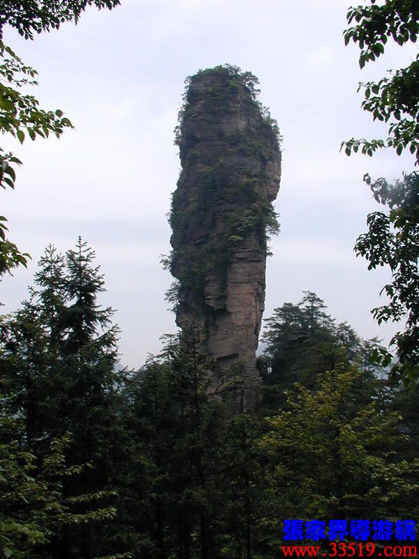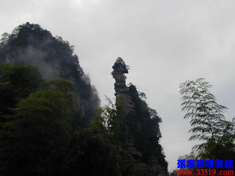 在整個武陵源風景名勝區(qū),類似“天書寶匣”這種形態(tài)各一的景觀比比皆是。因此,您盡可以發(fā)揮各自的想像力,給它們取一個有意思的名字。大家看,右前方那座高高的石峰,像不像掛著的一塊石碑?那就是龜精倉惶中丟下的天書,民間叫“天書高掛”,三個山峰之間正中的那個山峰,像不像只報曉的金雞?傳說龜精盜天書之時,正趕上金雞報曉,故名金雞報曉。