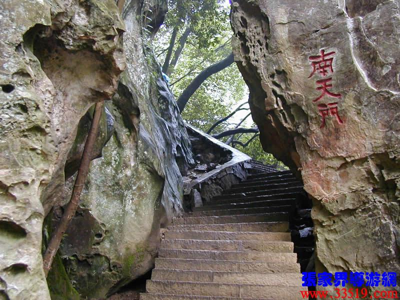 (南天門)(前行20米)現(xiàn)請大家抑頭望,可見一洞門,此門高約30米、寬4米左右,由游道兩側的兩座石峰斜傾拱峙而成。門右邊不遠處一峰高約20米,峰頂如人頭,有臉有面,似把門將軍。