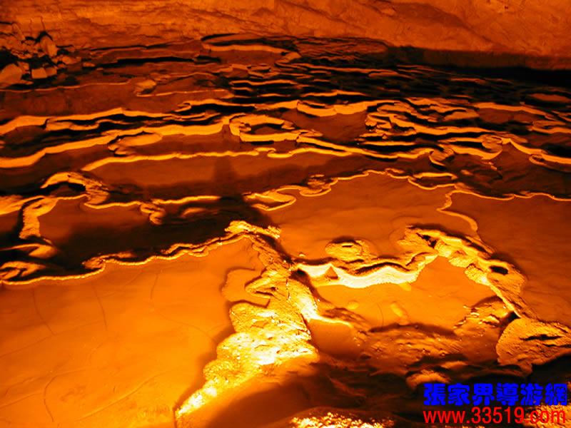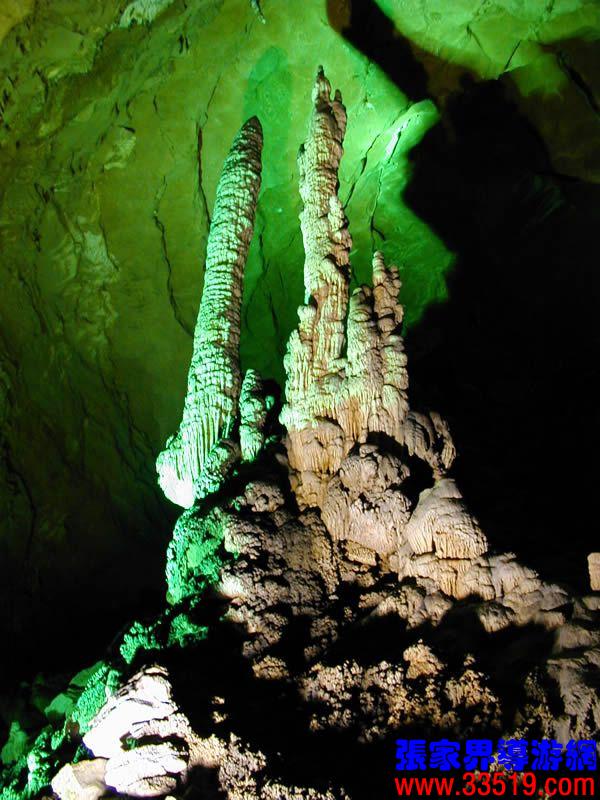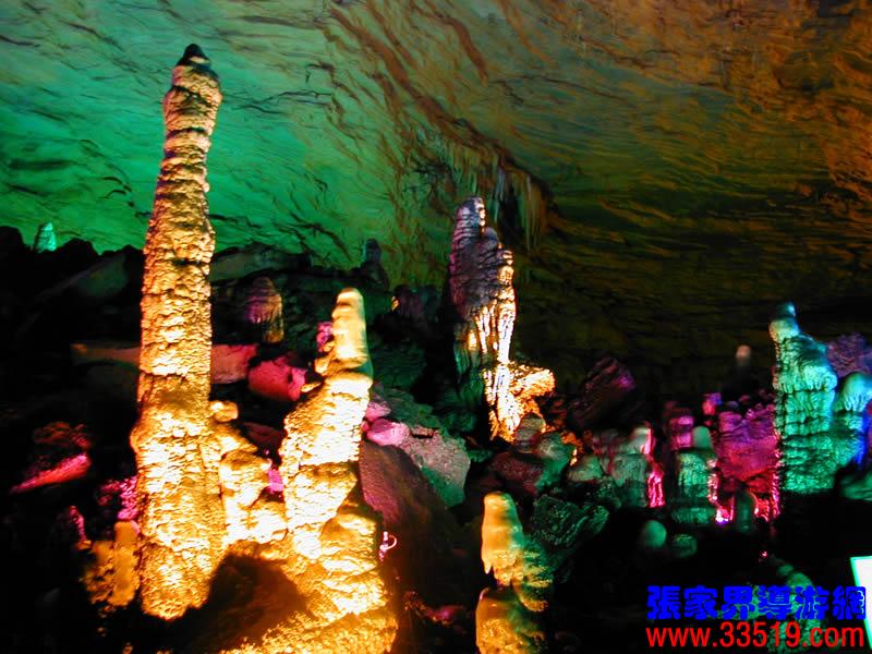(龍宮)龍宮是黃龍洞十三個(gè)大廳中最大的一個(gè),也是景色最美的景點(diǎn)之一,底面積15000平方米,平均高40米,兩千余根石筍拔地而起,千姿百態(tài),異彩紛呈,或如飛禽走獸,或如宮廷珍藏,有的像巍巍雪松,有的像火箭升空。龍宮后園有金銀兩座花池,清水常溢,花簇盛開。宮頂鐘乳柳垂簾掛,四周壁畫栩栩如生。溶解著各色各樣的礦物質(zhì)的水,從巖層中滲透出來,滴落下來。礦物質(zhì)在洞頂凝固結(jié)晶成倒懸鐘乳石,從鐘乳石滴落的水又把礦物質(zhì)澆疊、堆壘在洞底,而長成節(jié)節(jié)向上的石筍。大家看看這龍宮的造型,領(lǐng)略這磅礴的氣勢。洞內(nèi)最大石筍,高12米、直徑10米的漢白玉天然石椅“龍王寶座”居高臨下,眾多石柱石筍似人似物,維妙維肖,圍著寶座朝拜山呼,幾十座珊瑚亭亭玉立,儼然一支龐大的“宮廷樂隊(duì)”。湖南著名教授羊春秋先生作《寄生草》詞對(duì)此進(jìn)行描繪:“百態(tài)千姿模樣,三宮六院門巷。龍王開宴設(shè)瓊漿,猴王偷果鬧天堂,君王納寵擁羅帳。搬演了人間爭攘,匯集了天下奇觀。”
