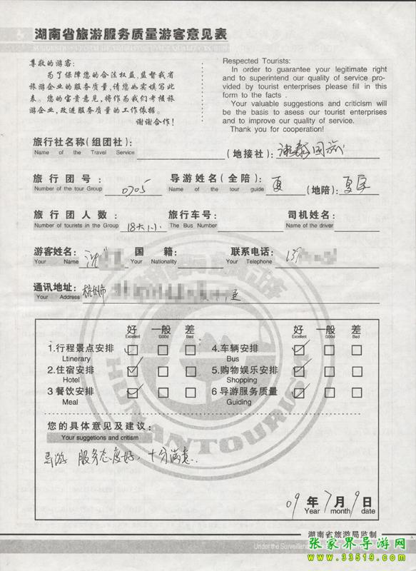 2009年7月5日杭州沈先生一行18人質量接待反饋單: