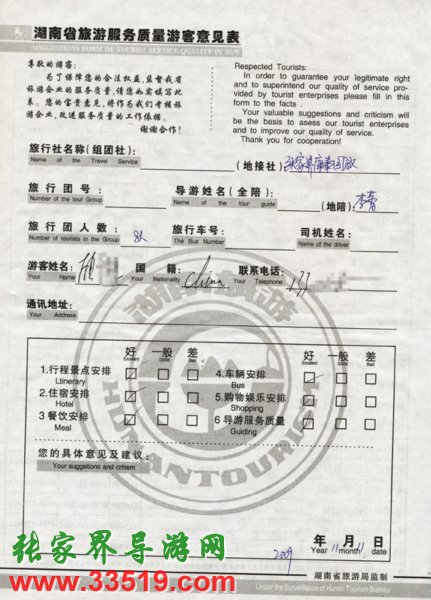 2009年11月11日顧先生一行8人旅游接待質量反饋單: