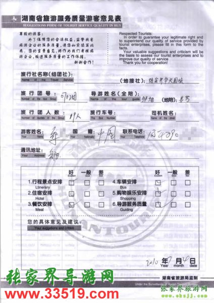 2010年7月4日岳陽(yáng)鄒先生一行19位旅游質(zhì)量反饋